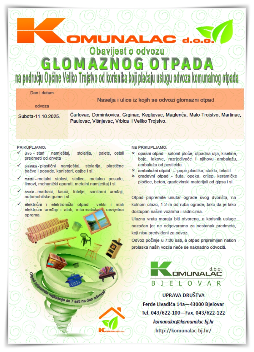Obaviještavaju se korisnici usluge odvoza komunalnog otpada da će na području cijele Općine Veliko Trojstvo odvoz glomaznog otpada biti u subotu 11. listopada 2025. godine od 7:00 sati.